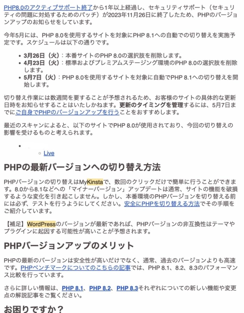 ある日、KinstaからPHPバージョンアップ依頼メールが届く