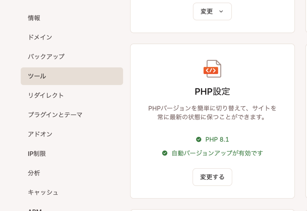 中程にある「PHP設定」の状態を見ます。現在のPHPバージョンが表示されているはずです。