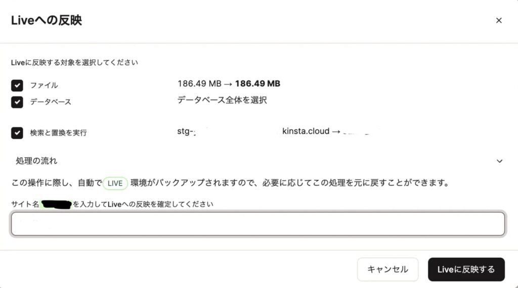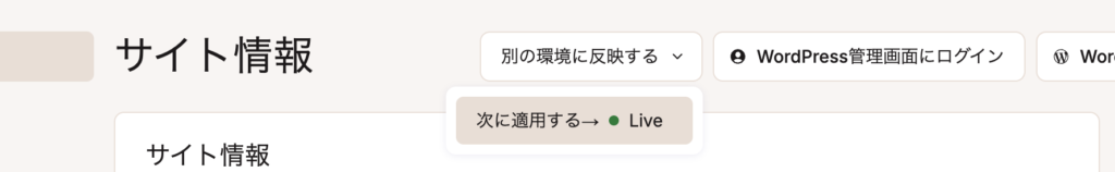 これはちょっとドキドキするところ。これも手順はワンポチです。ステージング環境のトップから「別の環境に反映する」を選択し「次に適用する→Live」を選択するだけ。(「Live」が本番環境のことです)
