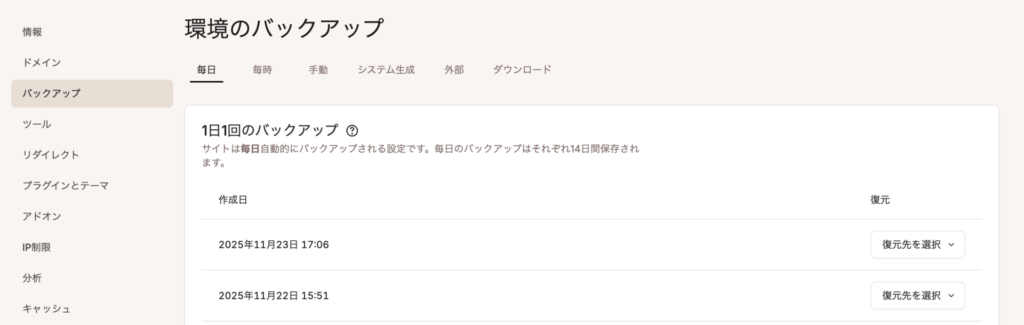補足:万が一本番環境で問題があれば自動バックアップから復元する