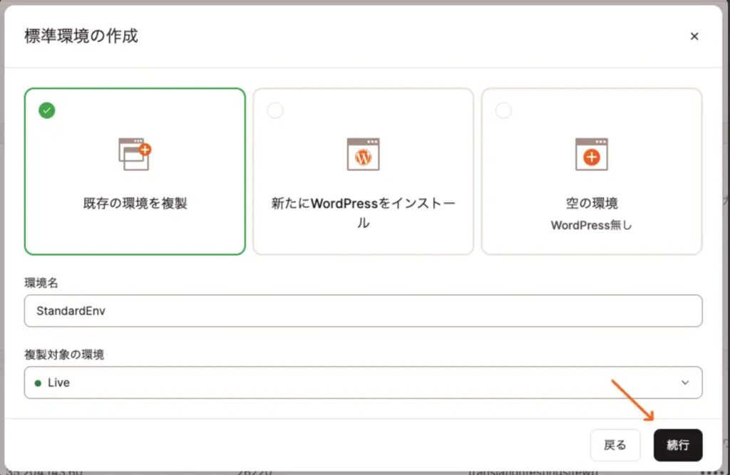 ログイントップで、自分のWordPressサイトの「Live」をクリックし、「新規環境の作成」からステージング環境を作成します。その後の画面で「既存の環境を複製」を選択すると、現在の本番環境がまるッとコピーされます。