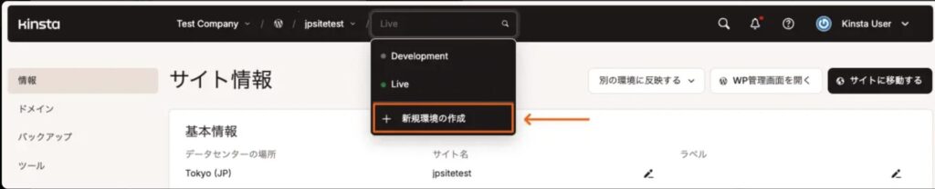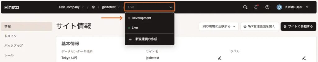 作成後、上記と同じ場所から現在選択している環境を「Live」→「作成したステージング環境(名前は自分でつけたもの)」に切り替えます。すると、画面に表示されている情報がステージング環境の情報に切り替わります。