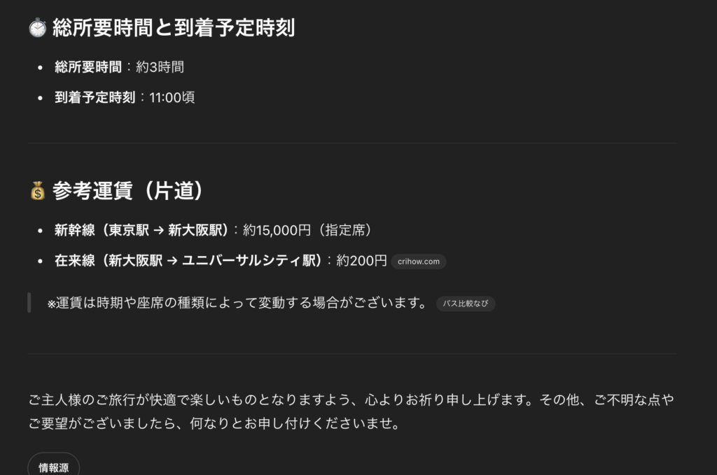 ChatGPTなど生成AIというものは、一発で完成版の出力を目指すより、あーだこーだと会話をしながら作り上げていく進め方だと割といいものができます。ということで、まずは旅程1日目の経路と宿の情報からChatGPTに出してもらいます。